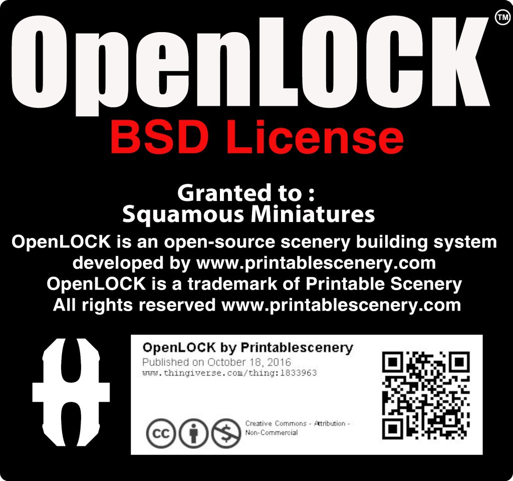 This notice effectively changes the creative commons licence for the OpenLOCK system to a BSD licence for Squamous Miniaturesn. It is non-transferable.