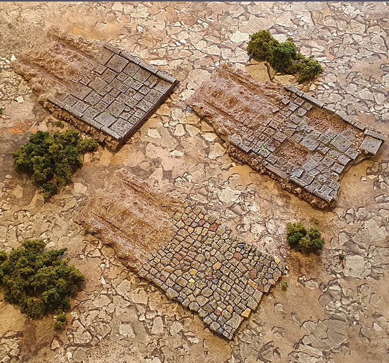 Transitioning the roads from a long, intact section to ruins was not always easy. Now with two new sections of flat-edged ruins, you can easily transition the roads between the two states. You can use them to create sections of ruins in a larger roadway or cap the end of a road.
