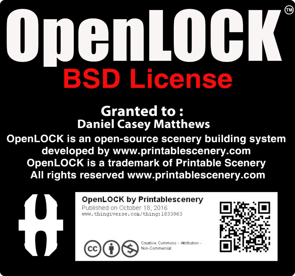 This license is not an endorsement by Printable Scenery, and Printable Scenery does not accept any liability for  variations of the OpenLOCK system