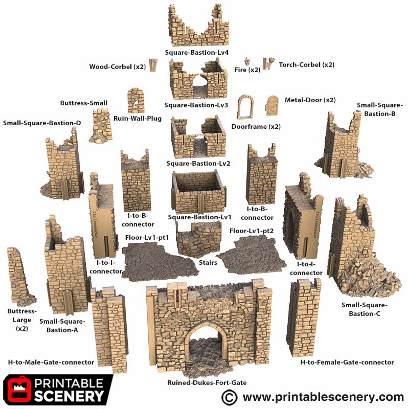 See below how the Ruined Duke’s Fort tessellates with the Castle Walls. NOTE: to achieve this, you’d need to use the “Ruined-Dukes-Fort-Small-Square-Bastion-A” on all four corners.