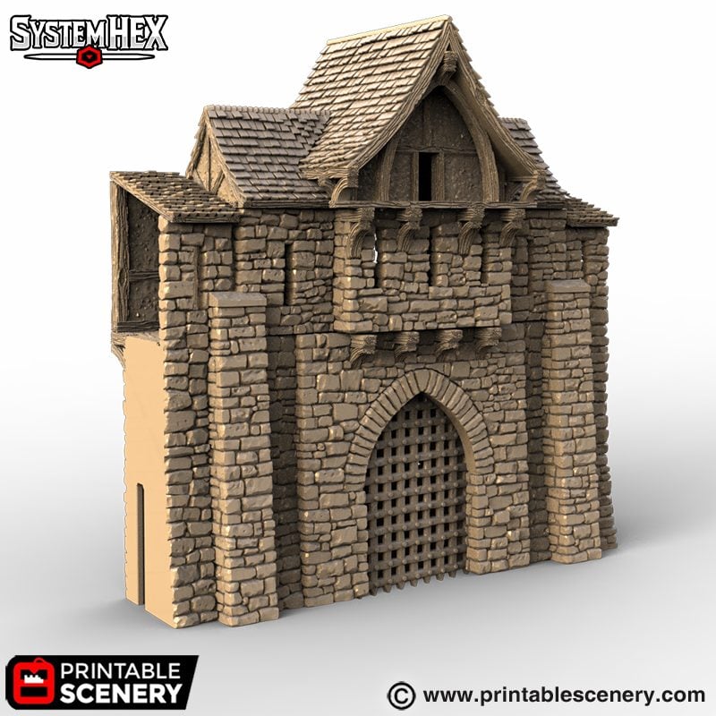 Hi Stew, The Hex Castle Gatehouse comes with two Portcullis options. The Flat back option that is printed flat on the buildplate or the Whole Portcullis that will require supports.